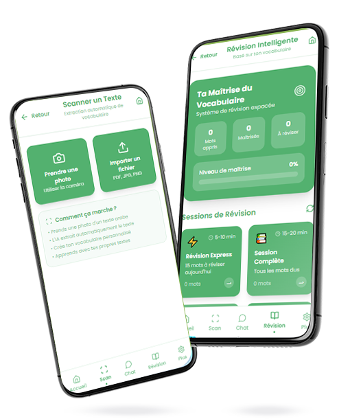 Une application intelligente qui vous permet d’apprendre l’arabe à partir de vos propres textes grâce à une IA interactive, une base de vocabulaire personnalisée et une révision moderne et efficace.